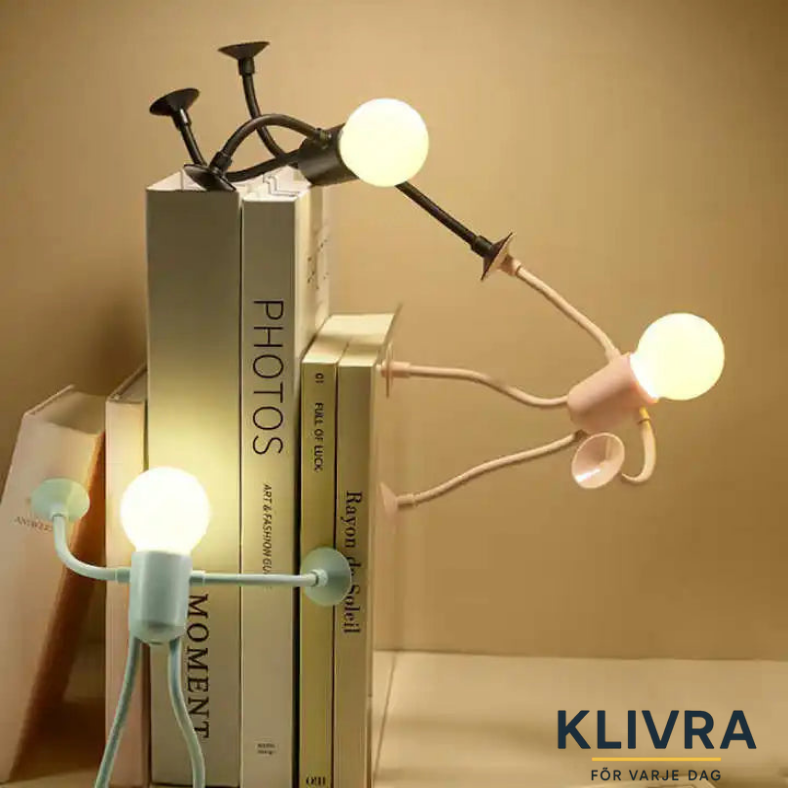 Ett lekfullt ljus med personlighet. De flexibla armarna och sugproppsfötterna låter den klättra hänga eller stå precis där du vill. Varmt mjukt ljus kombinerat med kreativ design ger den perfekta lilla följeslagaren på skrivbordet hyllan eller nattduksbordet.