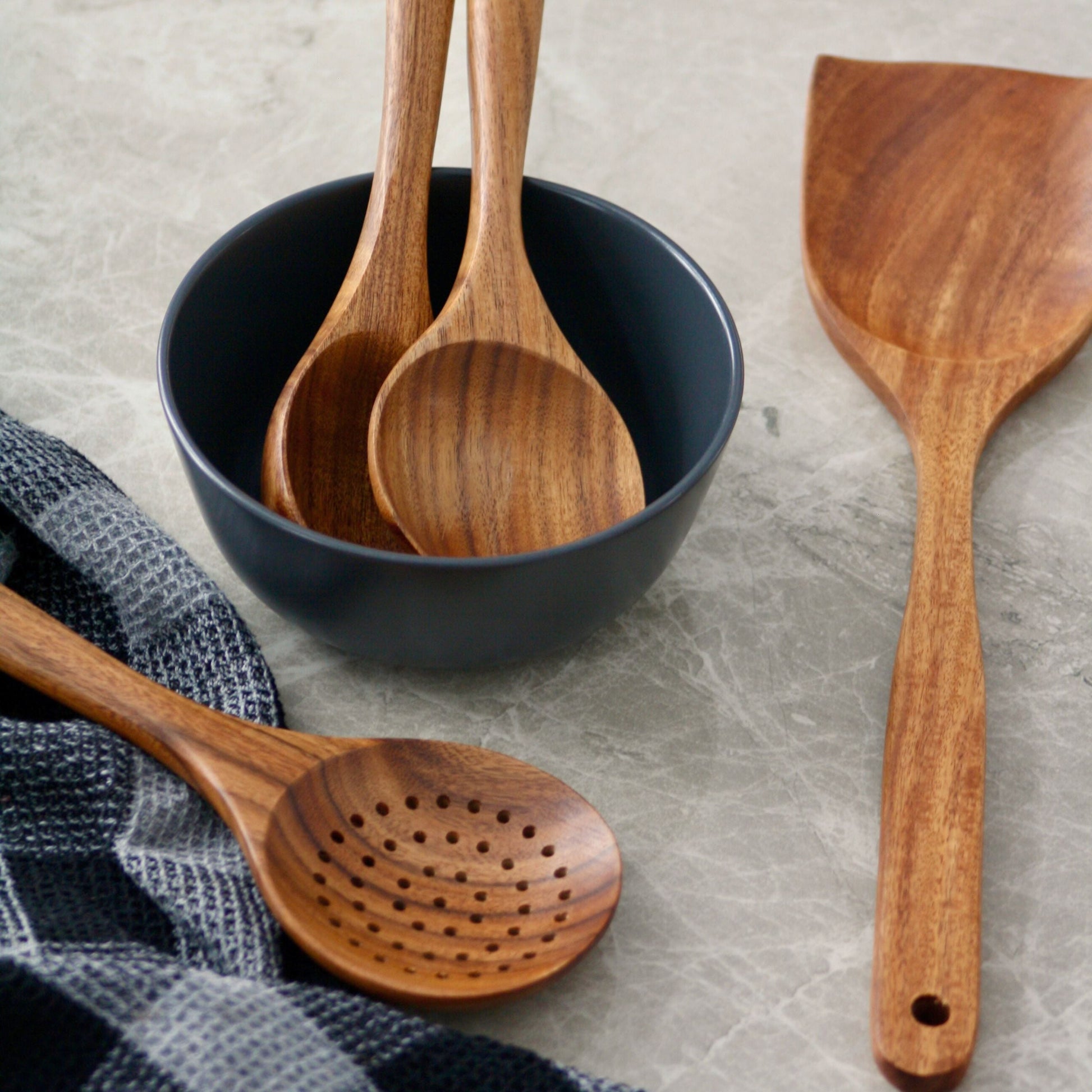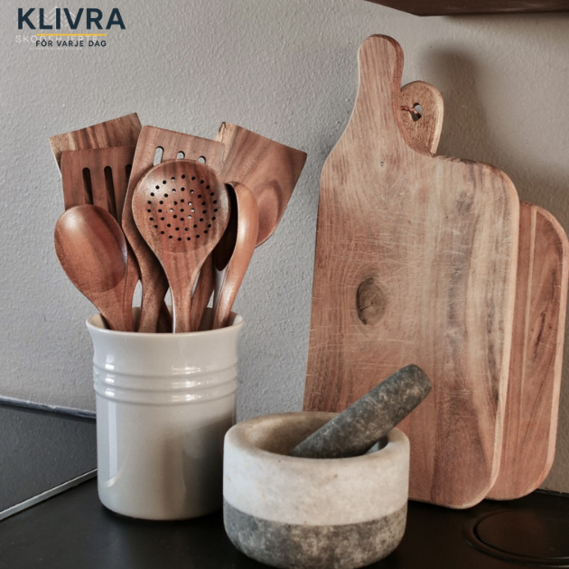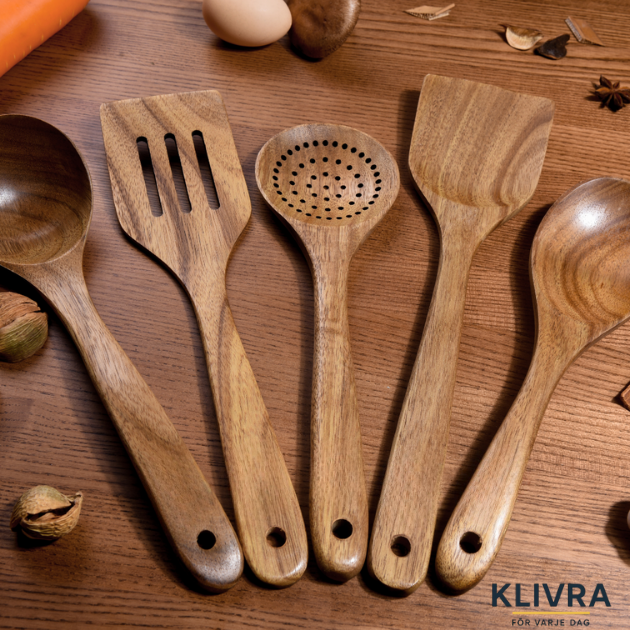 Våra skandinaviskt designade redskap är tillverkade av naturligt teakträ och behandlade med olivolja för extra hållbarhet: