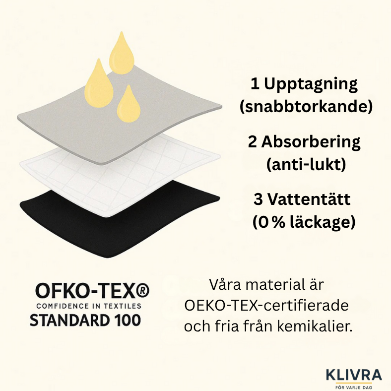 3. lagret – antimikrobiellt, vattentätt lager som förhindrar läckage och motverkar lukt.
